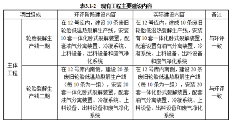 再生资源循环综合利用产业园项目三期工程,设计处理能力为6万t/a废旧轮胎低温裂解生产线,实际生产能力为3万t/a废旧轮胎低温裂解生产线,目前正常运行。